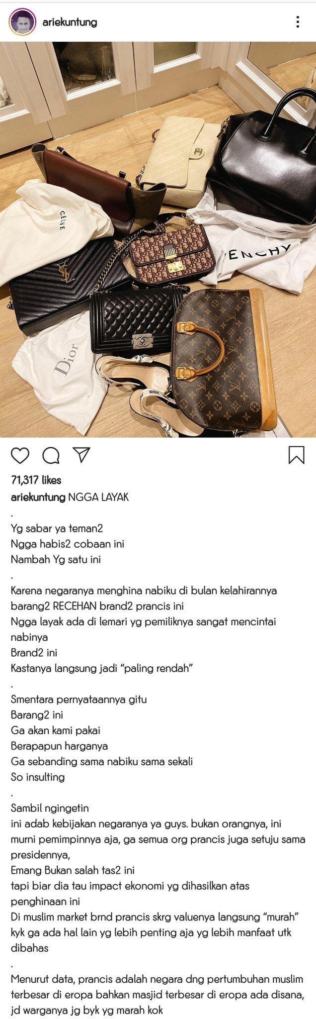 Kecam produk prancis arie untung buang semua barang branded dari dior sampai givenchy ke lantai rabu 28 oktober 2020 1510 arie untung ikut mengecam produk asal prancis credit. Dua perusahaan pembuat kendaraan ini juga terkena imbas boikot di turki. Sebab produk produk indonesia sendiri tidak banyak yang bisa menjadi substitusi produk prancis. Beberapa negara islam bahkan menyerukan aksi boikot berbagai produk dari negeri menara.