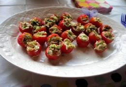 Scoop out the insides and drain upside down on a paper towel. Use a teaspoon measure to scoop out the seeds and pulp of each tomato. Spoon mixture into tomatoes. Cut slice off tops of tomatoes.