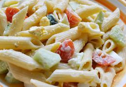 Thats the way my mama made it and my mama couldnt be wrong. Ingredients 16 oz uncooked elbows 4 cups grape tomatoes cut in half 2 cups 1 small zucchini sliced and quartered 12 cup red onion finely chopped 7 tbsp light mayonnaise hellmans 2 12 tbsp red wine vinegar 2 tbsp fat free greek yogurt 2 tsp dijon mustard 14 tsp oregano 14 tsp garlic powder. Add the macaroni tomatoes and onions. Macaroni salad should have mayonnaise eggs and green olives and thats about it.