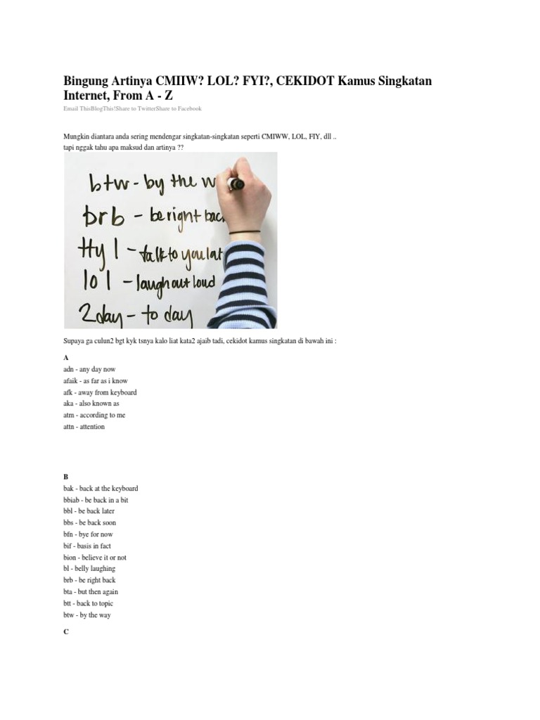Brb untuk brb sendiri memiliki kepanjangan be right back. User2 logs off user2 comes back on later. Kata kata singkatan hampir selalu ditemukan di setiap sosial media biasanya di twitter yang irit sekali dengan jumlah karakter posting di forum atau chat room. Istilah istilah itu sebenarnya adalah sebuah singkatan kata yang lazim di pakai orang orang orang di komunitas dunia maya internasional menggunakan bahasa inggris.