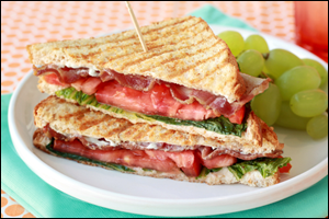 Turkey blt deli style turkey swiss cheese and hickory smoked bacon topped with mayo thick cut tomato and crisp chopped lettuce served hot from the oven on an artisan style ciabatta roll.