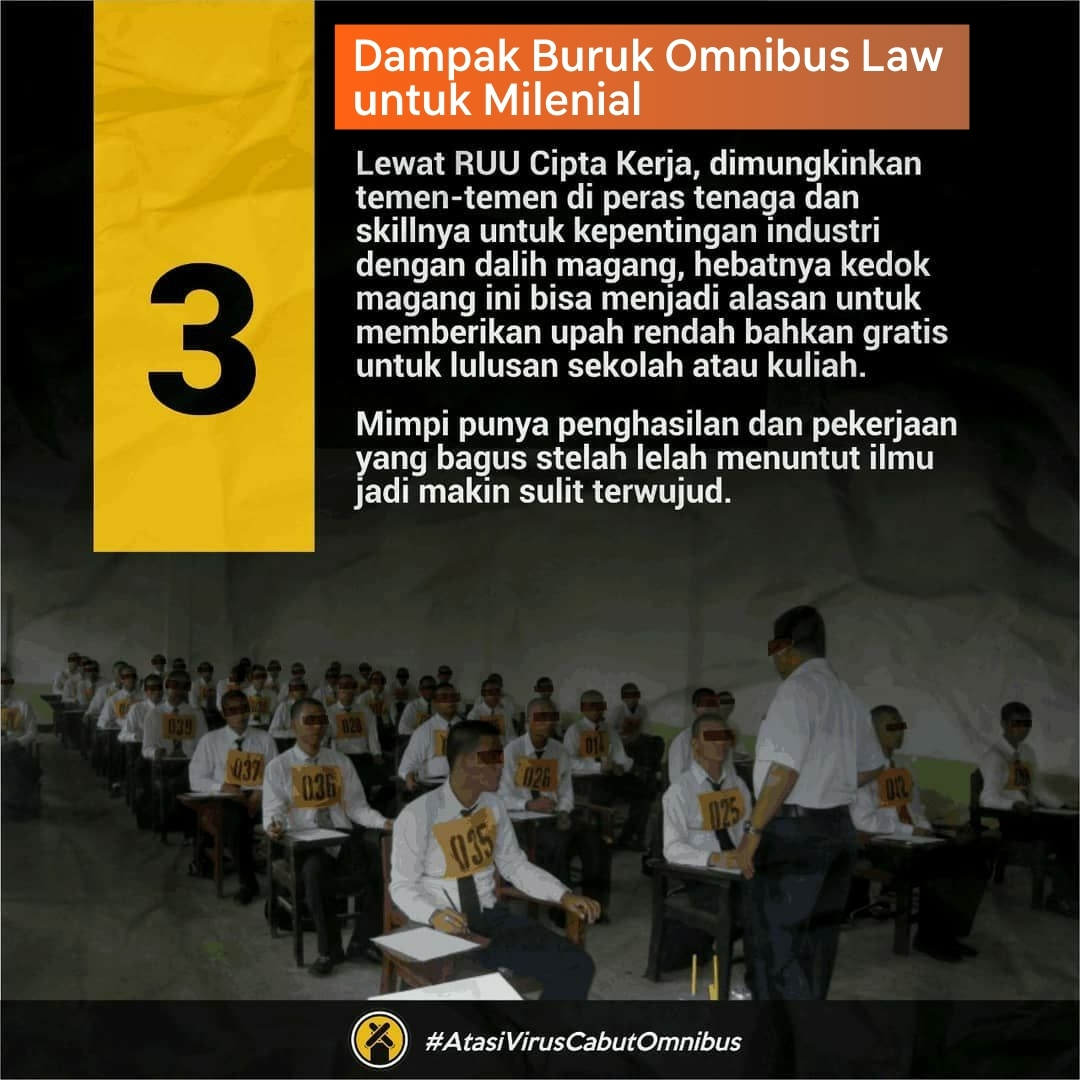 Atas kebijakan ini omnibus law menjadi uu nomor 11 tahun 2020 tentang cipta kerja. Hal ini dilakukan untuk mengantisipasi masuknya penyusup di tengah tengah buruh dan mahasiswa yang demo menolak ruu cipta kerja pada hari ini 28102020. Seperti diketahui sejak awal substansi ruu cipta kerja menjadi sorotan publik karena banyak pasal yang dinilai bermasalah. Pertama akan diberikannya kompensasi kepada pekerja kontrak yang di phk dalam masa kerja minimal satu tahun.